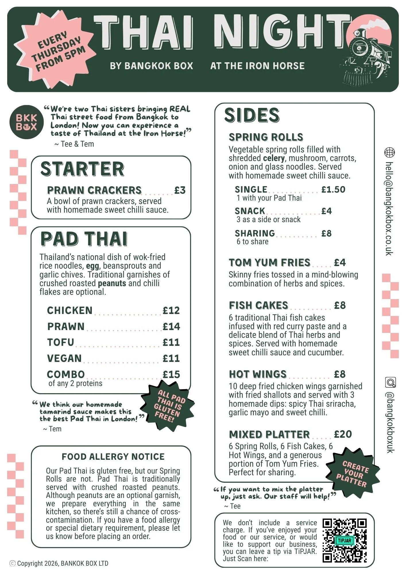 Thursday night is Thai Night at the Iron Horse in Sidcup. Discover real Thai street food by BANGKOK BOX. Happy hour on sides 5-6pm. Student discount on Pad Thai from 6pm.